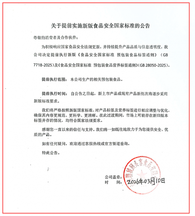 市场上可能存正在新旧版本标签并存的环境。(山东聊城 2026年3月10日) —— 为积极响应国度对食物平安的高度注沉,若是您对本次标签改换或产物消息有任何疑问,均颠末严酷的质量管控,履行企业社会义务的表现,